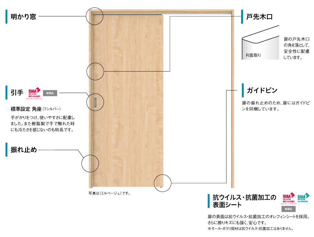 明かり窓\n引手:標準設定 角座〈Tシルバー〉抗ウイルス機能 ビオタスク。手がかりをつけ、使いやすさに配慮しました。また樹脂製で手で触れた時にも冷たさを感じないのも特長です。\n振れ止め\n戸先木口\nガイドピン:扉の振れ止めのため、扉にはガイドピンを同梱しています。\n抗ウイルス・抗菌加工の表面シート:扉の表面は抗ウイルス・抗菌加工のオレフィンシートを採用。さらに擦りキズにも強く、安心です。※モール・ガラリ部材は抗ウイルス・抗菌加工はありません。