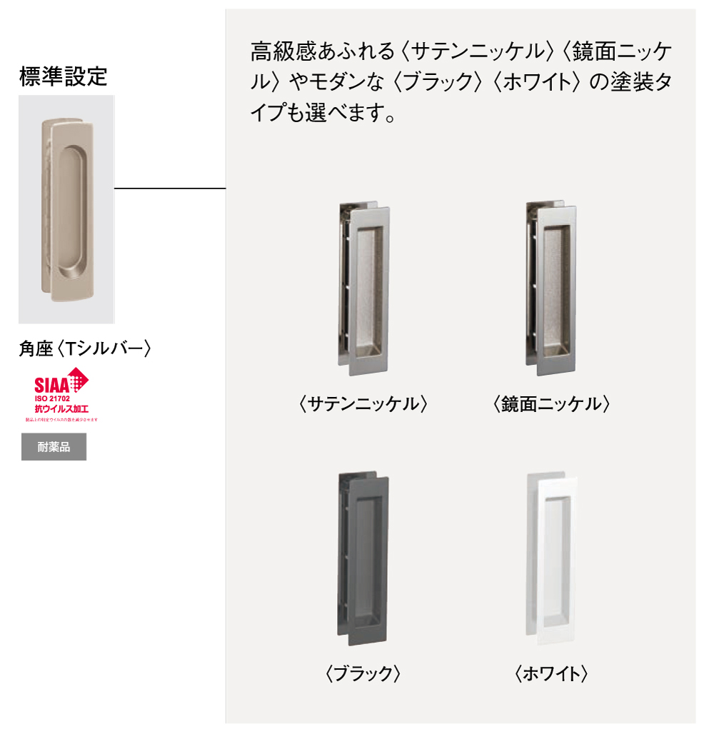【オプション・オーダー対応】引手が選べます\n※ 標準設定の引手以外は、抗ウイルス機能は付いておりません。