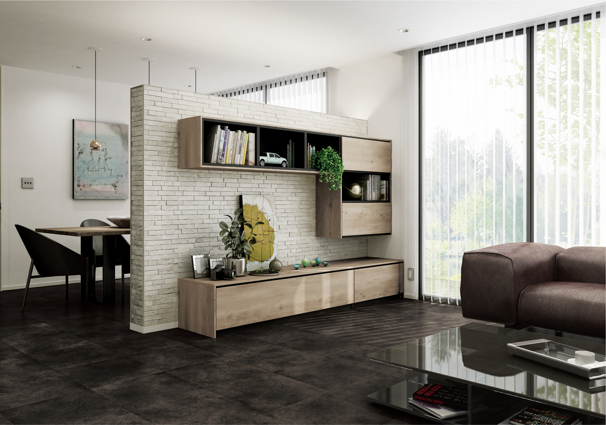 | キャプション | 床材:ハピアフロア スクエア 〈アイアンブラック〉 |