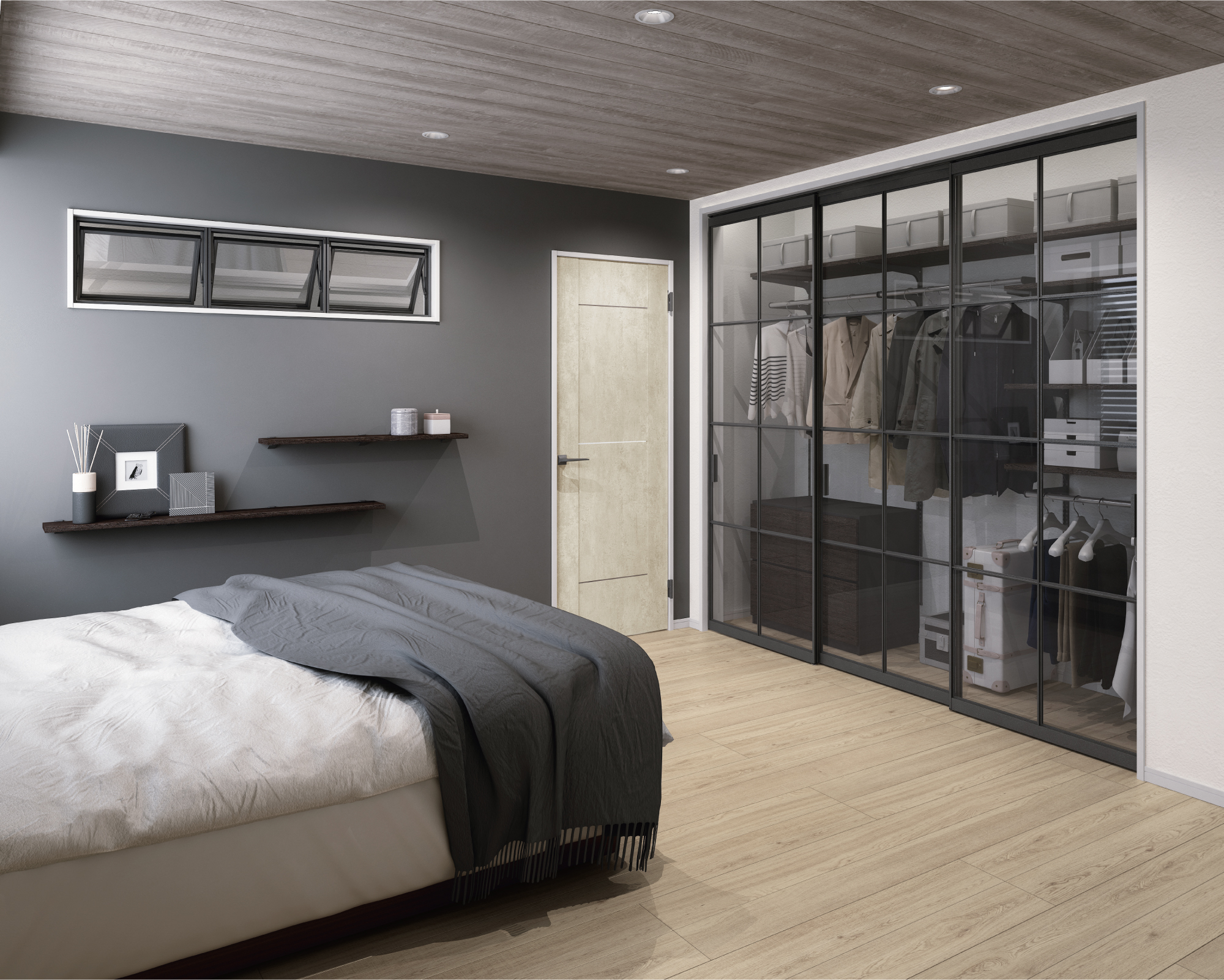 | キャプション | 間仕切戸:ラインフレーム[インセット] 3枚引違 格子採光 〈ブラック〉 |