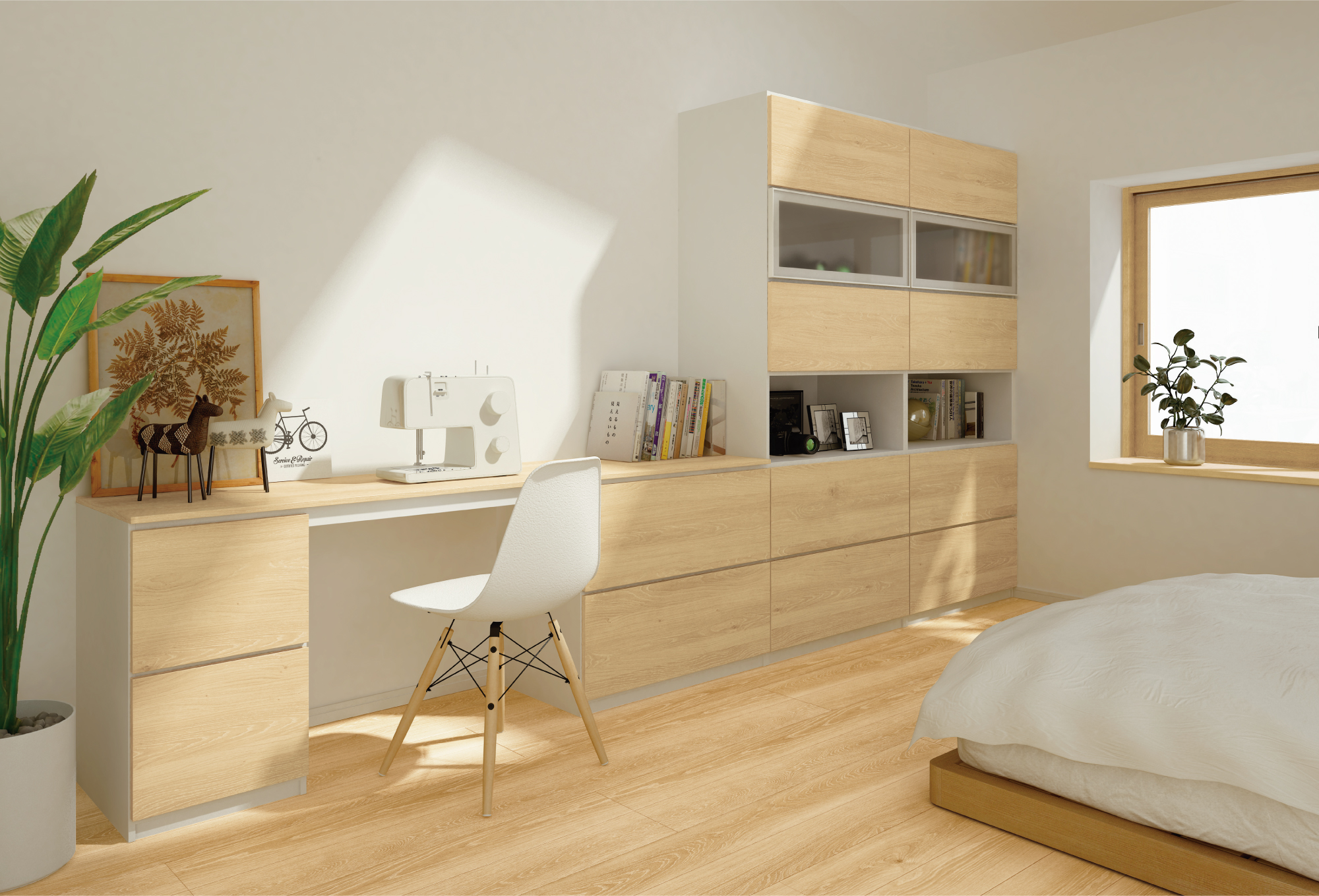| キャプション | 収納:スタイリッシュファニチャー MiSEL(ミセル)PLAN39 扉・カウンター:〈ミルキーオーカー柄〉 フレーム扉:〈ホワイト/ミスト〉 ユニット:〈ホワイト〉 床材:イエリア セレクト プレミアムウッド柄〈ミルキーオーカー柄〉 |
