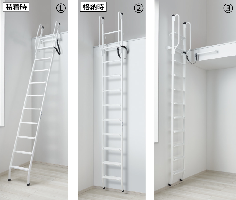 | キャプション | ①昇降用パイプにしっかり掛けてから昇り降りしてください。踏板の奥行は90㎜。 ➁使用しないときは放置せずに、パイプに掛けてください。 ③格納用パイプ(オプション) ロフト下に空間がある場合は、必ず格納用パイプ(オプション)をご使用の上、格納してください。 |