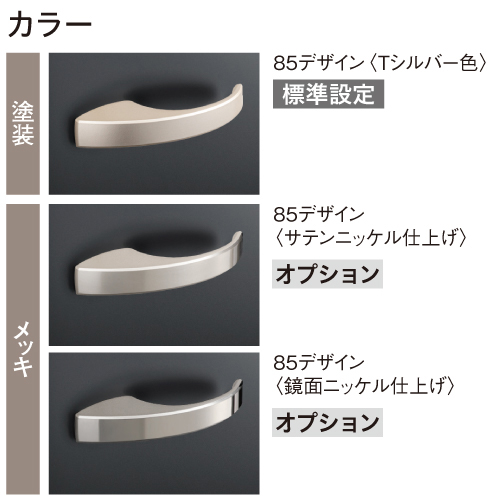 | キャプション | レバーハンドルカラー 上品な風合のサテン調塗装〈Tシルバー色〉のほか、オプションで落ち着きのある光沢の〈サテンニッケル仕上げ〉と高級感あふれる〈鏡面ニッケル仕上げ〉、抗ウイルス加工タイプのハンドルもお選びいただけます。 |