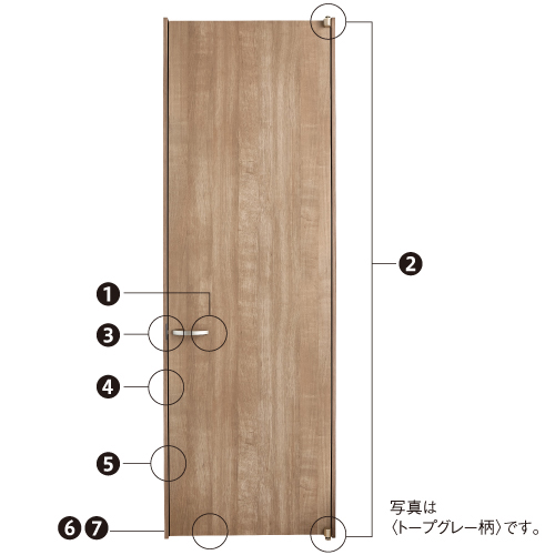 | キャプション | 二方枠ドア 基本仕様 (1)ショートストロークレバーハンドル (2)丁番 (3)静かな開閉音の消音ラッチ・気密パッキンの付いた戸先側の戸当り (4)樹脂の使用量を減らし、環境に配慮した戸当り (5)戸先木口 (6)後付けドアストッパー(オプション) (7)内蔵ドアストッパー(オーダー) |