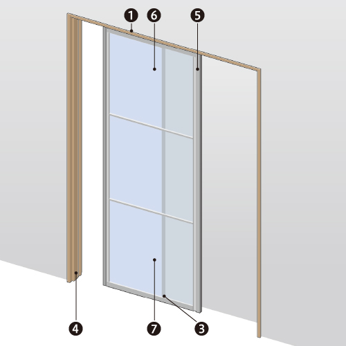 | キャプション | (1)吊戸レール[インセット] (3)モヘア[インセット] (4)戸じゃくり (5)扉・フレーム (6)採光板 (7)スケルトン扉バリエーション |
