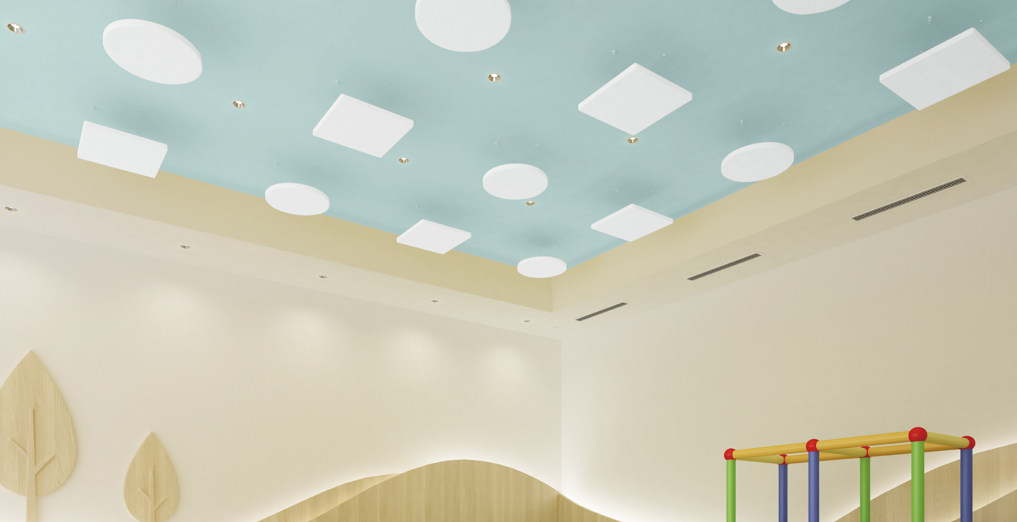 | キャプション | 天井用吸音パネル:KIN TONE(キントーン) サークル(円形) 〈ホワイト色〉 スクエア(四角形) 〈ホワイト色〉 |