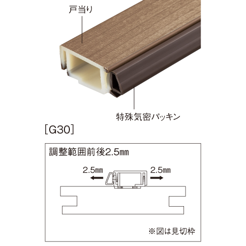 | キャプション | ●調整機能付戸当り 戸当りの前後調整機能により、扉と特殊気密パッキンの当たり具合を調整できます。 |