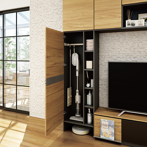 楽しみにしていたTV壁面収納が、いよいよ我が家のリビングにやってきました。ティッシュを隠したまま使える専用ボックスや可動式のゴミ箱。小物が散らかりがちなリビングには、機能的ですっきり収納でき、掃除道具などリビングで使うモノを用途や頻度に応じた場所に収納することができます。