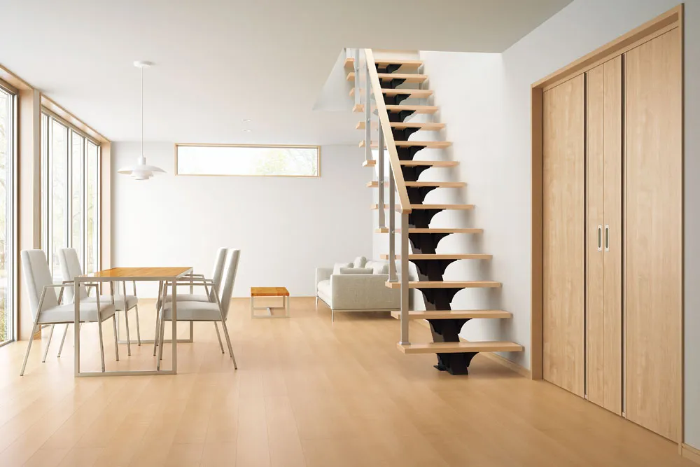 踏板の下の蹴上(けあげ)の部分が空いているので、視界が開け、すっきりとしたイメージでリビングに設置しても圧迫感がなく、部屋を広く明るく見せることができます。固定金具でしっかりと踏板を桁材に固定するので安全面も安心です。