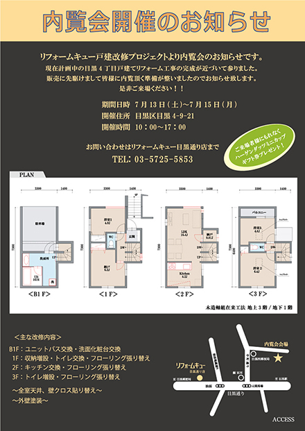 販売に先駆けまして2019年7月13日(土)-7月15日(月)の3日間、目黒区目黒にて内覧会を開催致します。