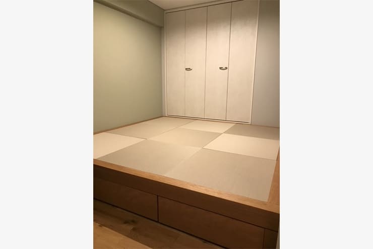 - キッチンを、オープンにし、ダイニング、リビングへが見渡せる明るい空間にした。また、視界を遮らない場所に 収納スペースを提案。おうち時間でみんなが使えるデスクスペースや、快適な空気環境を維持するため、調湿機能の天井材の採用を随所に提案。従来の和室には、小上がり収納を設置し、リビングとの間仕切は、ロールスクリーンで対応。