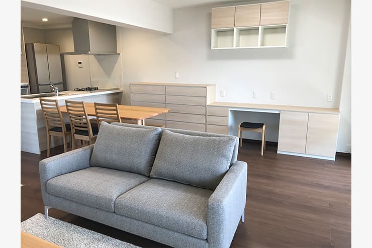 - 床を二重床にすることで、床の段差を極力なくし、フラットすることで、空間移動をスムーズにした。キッチンは、L型でいつもリビングダイニングに背を向けて暗い感じになりがちなので、ご希望でもあった、フルフラットの対面型キッチンにする事で、LDへの開放感も確保できました。また、来客用にもお使いになられる和室は、コーナータイプのアクリル間仕切戸を使用することで、普段は、リビングの一部の空間として使用できるようにしました。内装は、暖かく、明るい落ち着いた感じのイメージにまとめました。リビングの一角には、収納スペースと、デスクを一体化させた、ご主人の書斎兼、趣味のコーナーも設えました。