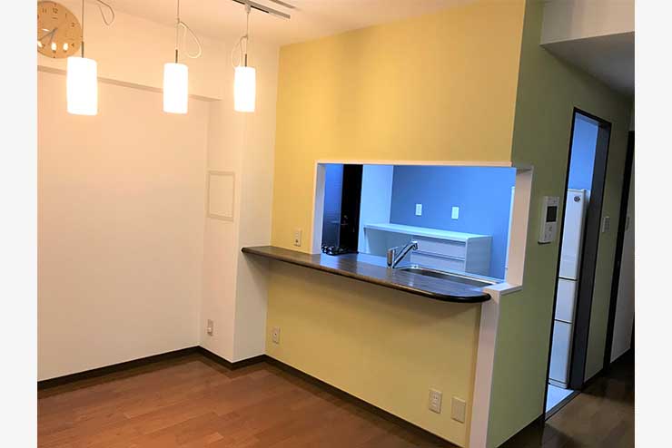 No.72:マンションリフォーム マンションの対面キッチンからダイニングへの視界を広げたいが、壁を全ては取りたくない。