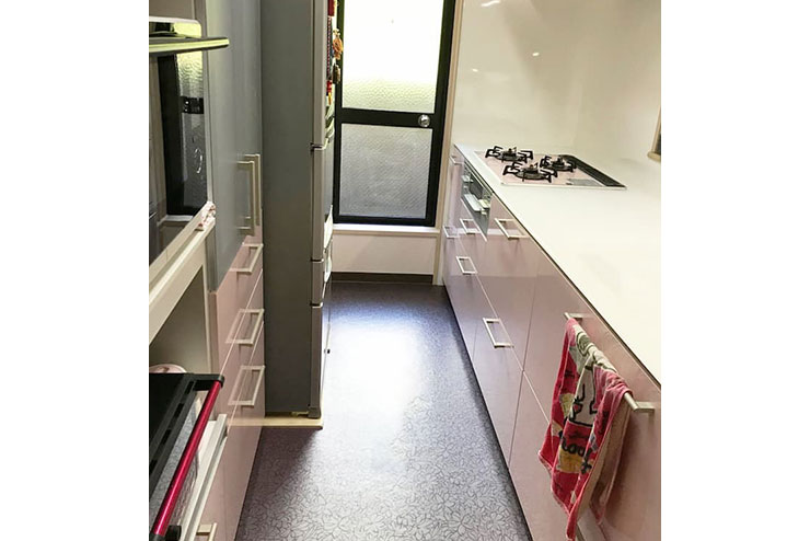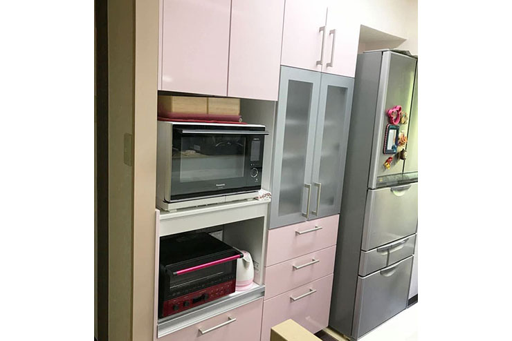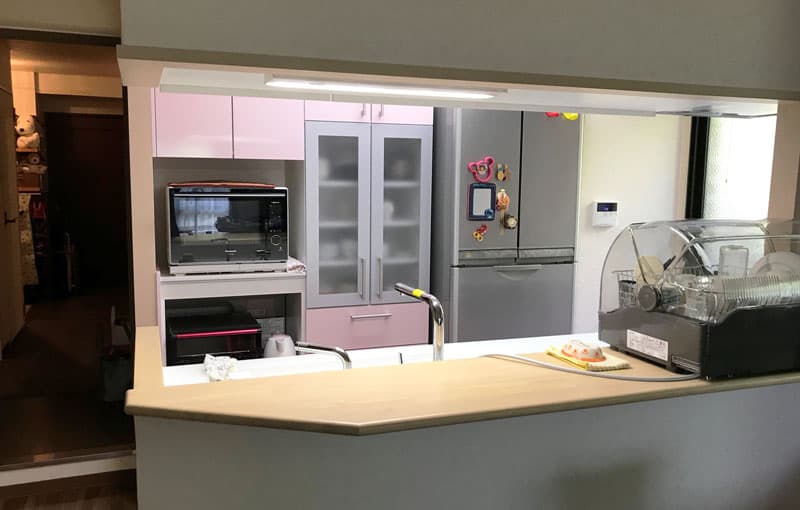 - ショールームで、一目惚れしたピンクの扉のキッチンを選びました。キッチンは明るくなりカップボードの収納量も十分に確保され、使いやすくなりました。またカウンターの側面の腰壁を一段低くし、周囲の木の色を明るいナチュラルに統一しました。そのことによって廊下から入ってきた時や、キッチンからダイニングを見た時の圧迫感も感じなくなりました。