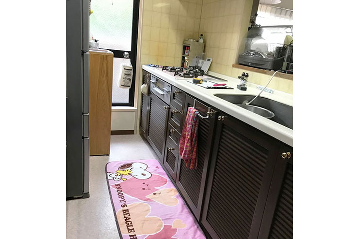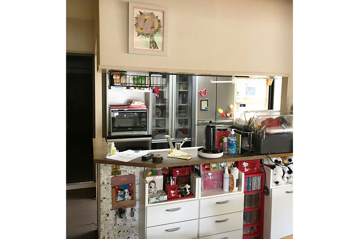 - カウンターは、L字型一体型となっていたものを、あえてキッチン横の腰壁部分のみ一段下げました。また他の木部も併せ、明るいナチュラル色に統一することで圧迫感を無くしました。カップボードは、収納量を無駄なく確保するために、組み合わせサイズを工夫し、梁下ぎりぎりの高さまで確保できるようにしました。また、今まで使いにくかったスイッチも移動させることで使いやすくしました。