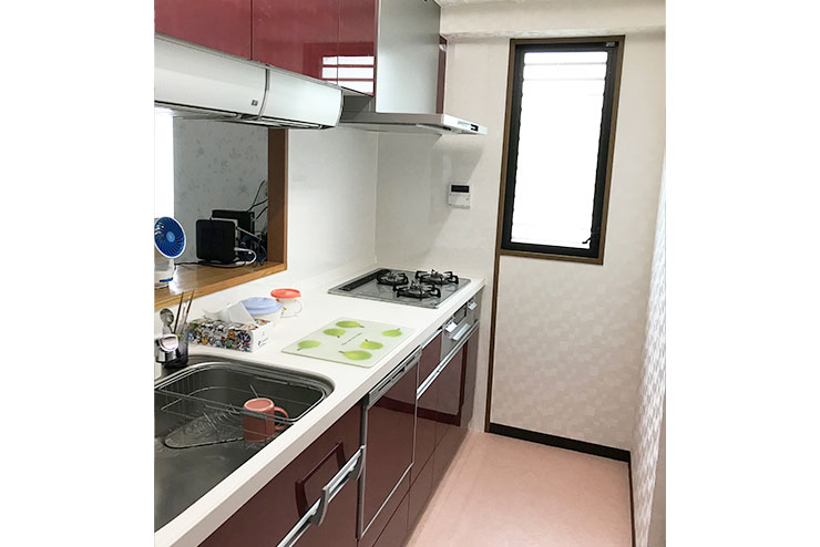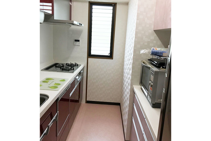 - キッチンは、背面の家電収納までの距離が近すぎて使いづらさがあったところを、I型のレイアウトにし、動線がスムーズになるように変更しました。