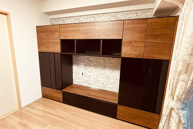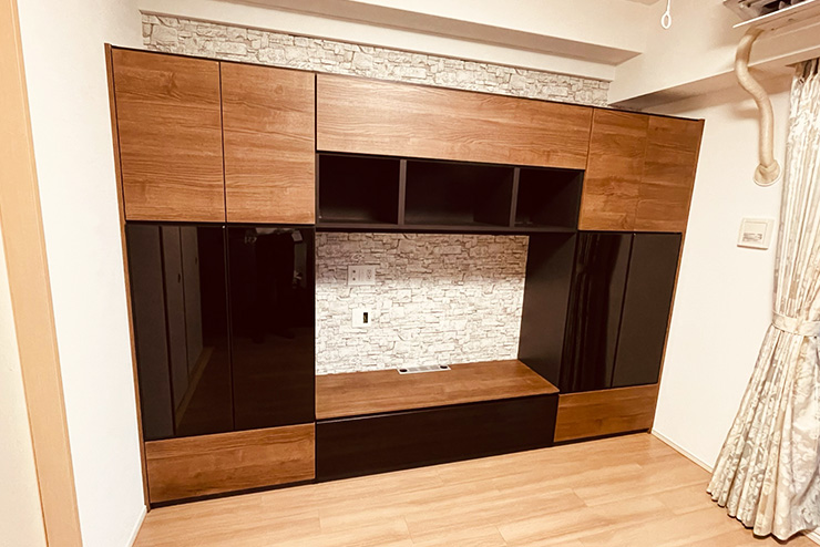 - 新築のマンションを購入し、TV台の設置を検討していました。標準サイズのミセルではシンメトリーにならず、多くのプランを検討しました。最終的に左右のキャビネット巾を特注サイズで製作していただき、解決できました。また、TVをリビングのセンターに壁掛けにて設置することも可能となりました。