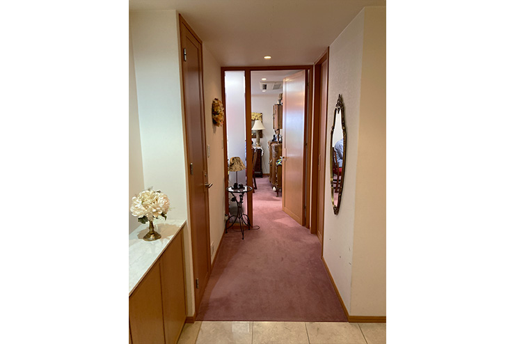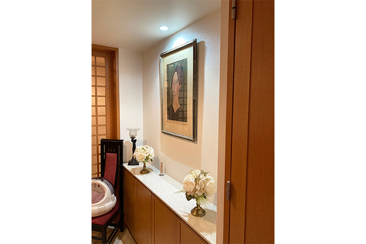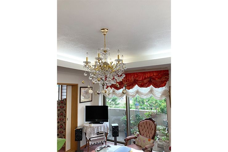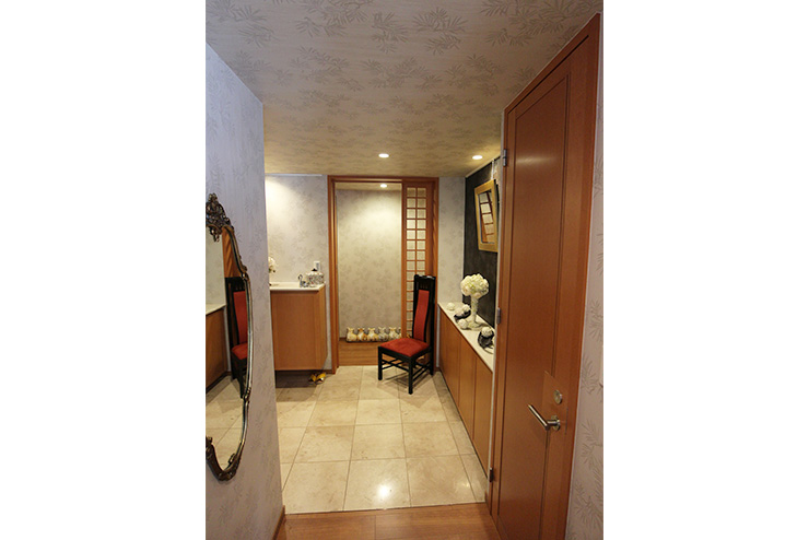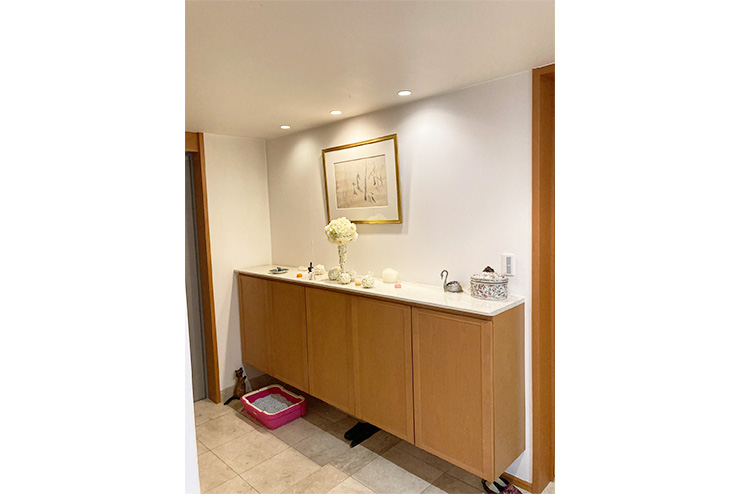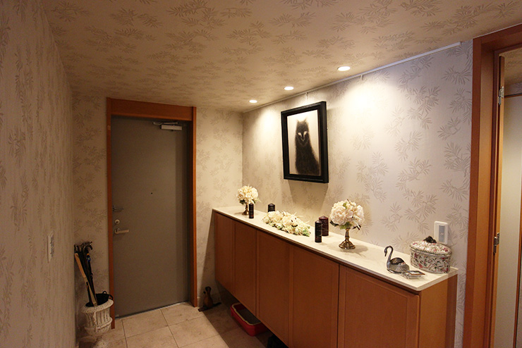 - 壁と天井のクロスの張替えを依頼しました。また床絨毯をフローリングに変更することも検討していました。紙クロスの独特の発色、布クロスの角度によって表情が変化するところが、家具や絵画にマッチしとても満足しています。玄関ホールは、ダウンライトの明るさや色が不揃いだったものを交換していただき、光色に統一感が出ました。