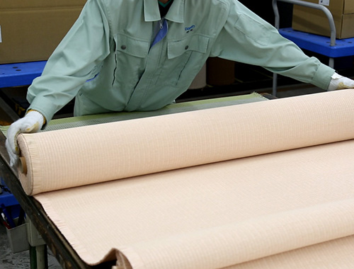 和紙を原料とした高機能な畳おもてを、岡山工場をはじめとした国内拠点でひとつひとつ丁寧に織り上げています。