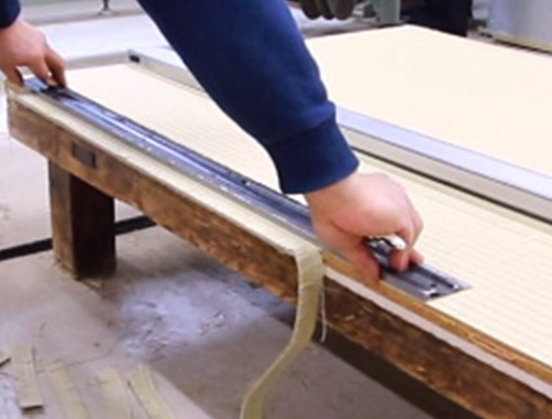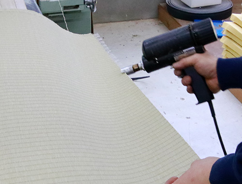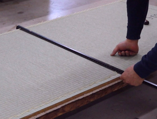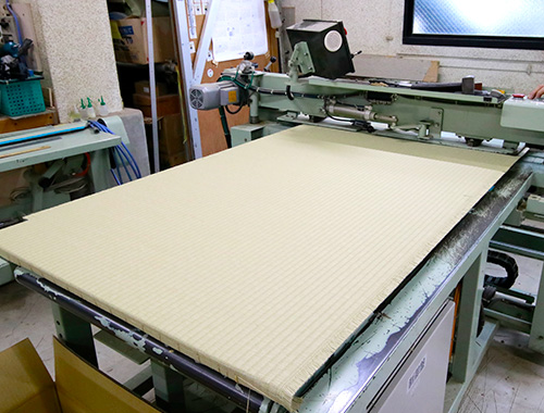 縁無し畳の場合、畳床のサイズに合わせてカットした後、織り目を付ける作業をします。