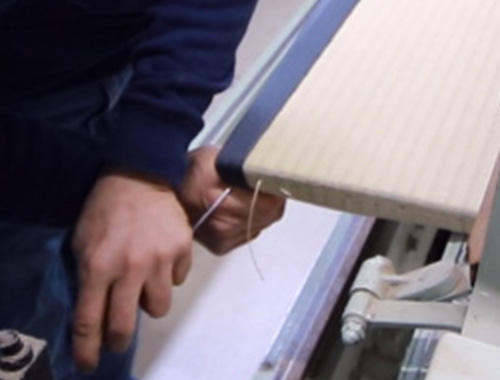 框縫い後、"耳"と呼ばれる余った畳おもてをカットします。縁無し畳の場合